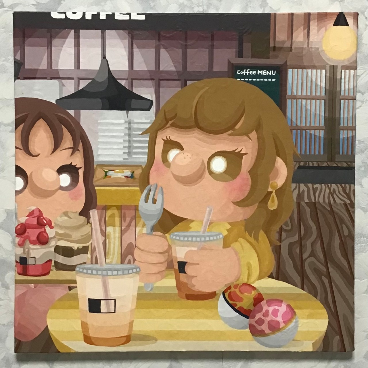 シルクスクリーンで凹凸を付けた上からアクリルガッシュで描きました。